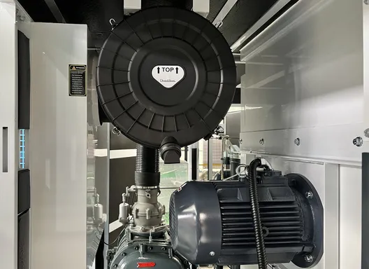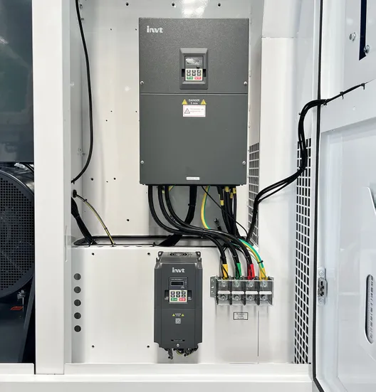 Главный двигатель компрессора и привод вентилятора оснащены частотными преобразователями компании INVT (возможны альтернативы от Siemens или ABB), расположенные в отдельном принудительно проветриваемом отделении, что гарантирует работу компрессора в жарких условиях. Воздух для охлаждения фильтруется при помощи дополнительного сетчатого фильтра, находящегося на корпусе компрессора. Инверторы объединены в единое электронное управление, упрощая монтаж и настройку устройств.