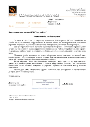 За годы работы мы зарекомендовали себя как надежный поставщик винтовых компрессоров для подготовки сжатого воздуха. Мы предлагаем своим клиентам лучшие условия сотрудничества, приятные цены и длительную гарантию. Благодаря индивидуальному подходу и высокому качеству услуг, партнеры ценят долгосрочное и комфортное сотрудничество с нашей компанией, подтверждая это благодарственными письмами и отзывами.